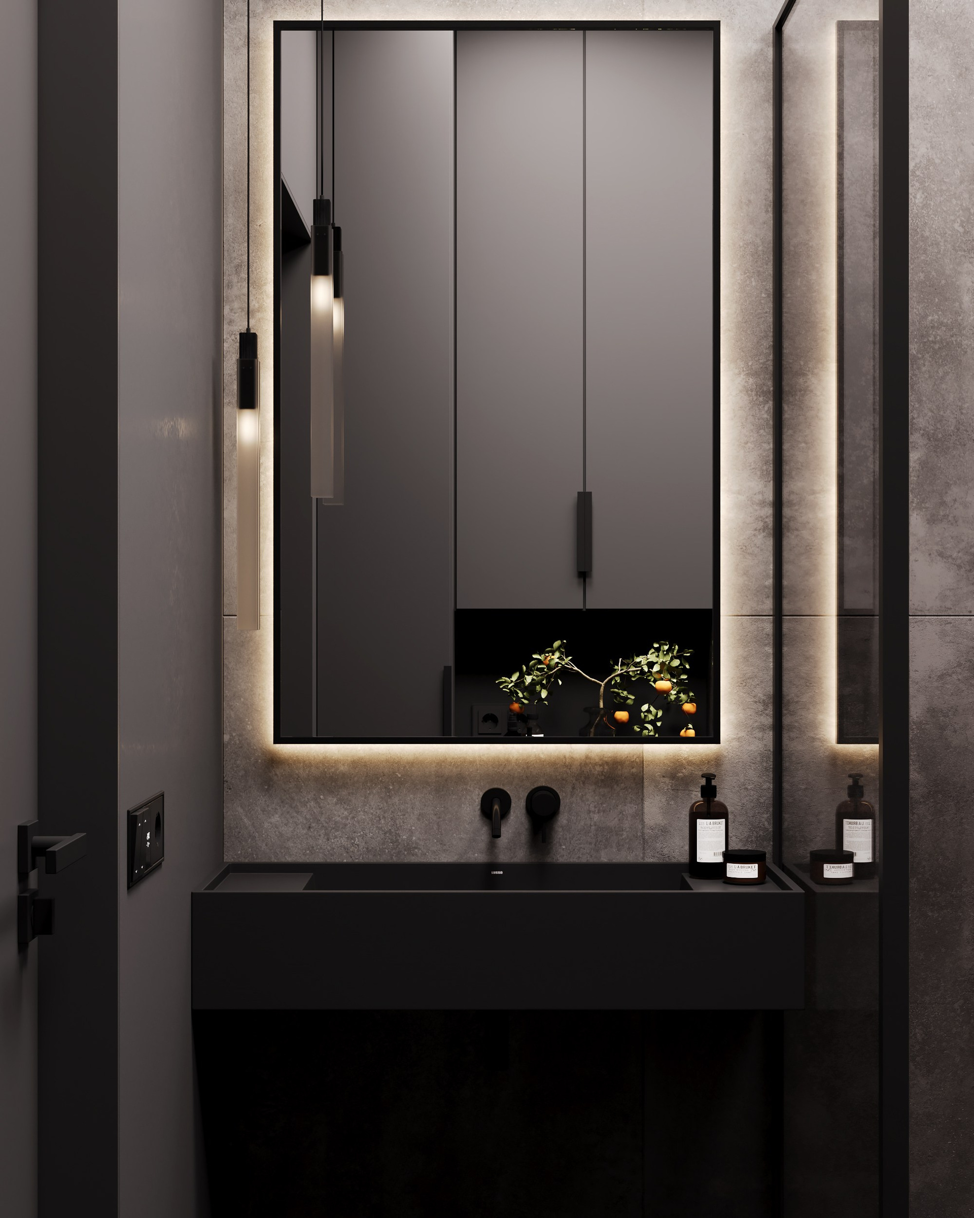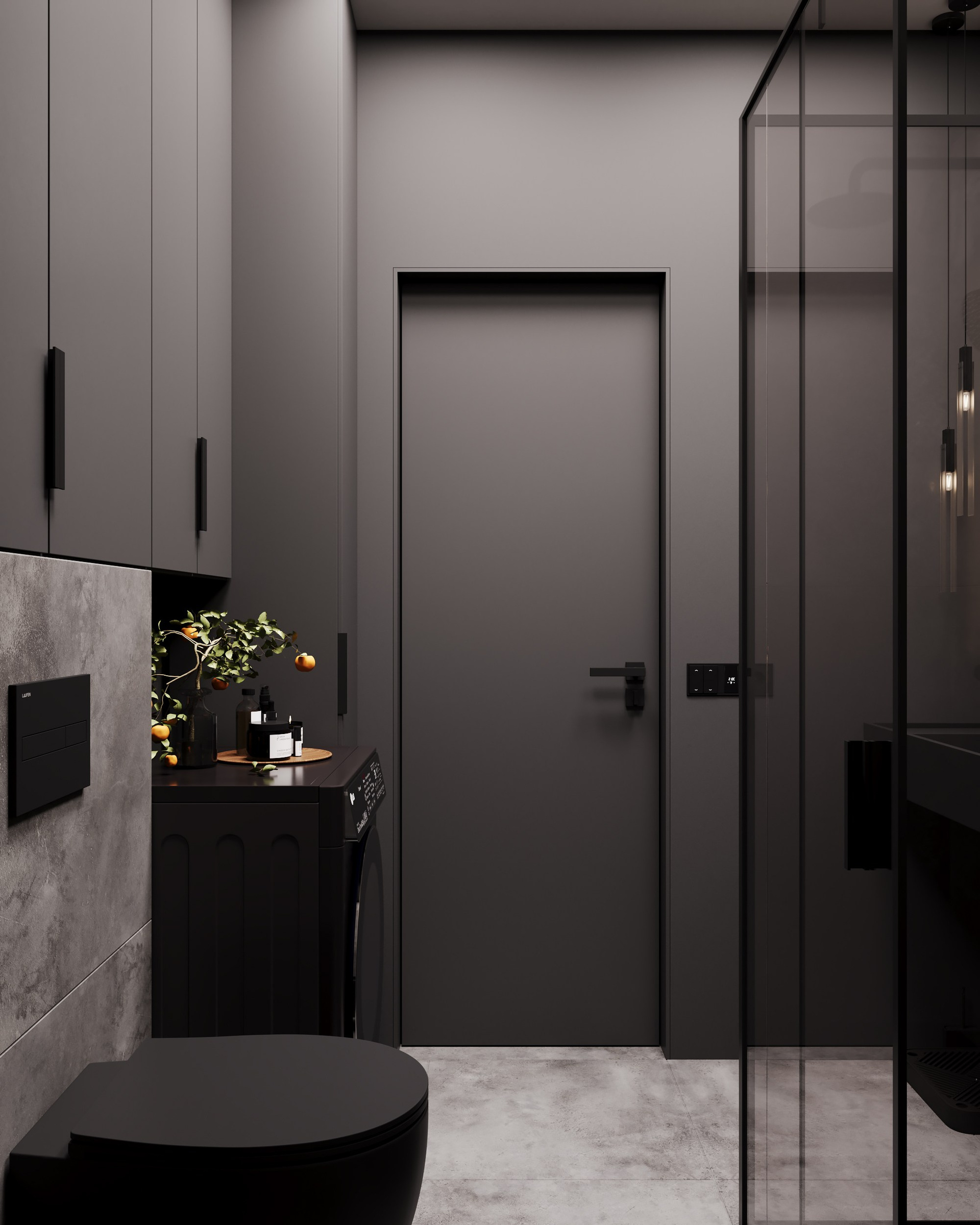 Black, winter bathroom